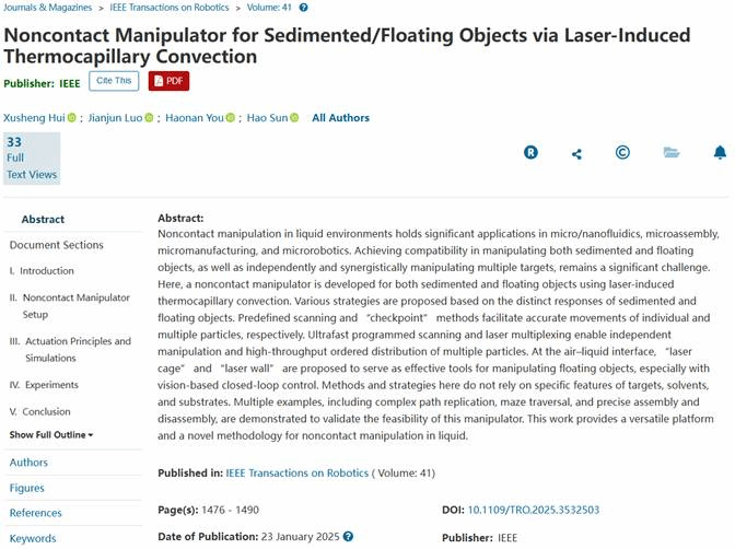 罗建军教授团队博士生惠旭晟在液体环境非接触式操控技术研究方面取得了突破性进展。相关研究成果以“Noncontact Manipulator for Sedimented/Floating Objects via Laserinduced Thermocapillary Convection”等为题形成了系列论文,发表在机器人领域顶级期刊《IEEE Transactions on Robotics》 (T-RO)、机器人顶会《IEEE International Conference on Robotics and Automation》 (ICRA 2025接收),以及机电领域顶刊《IEEE/ASME Transactions on Mechatronics》 (TMECH)上,成人综艺