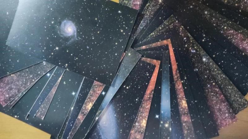 32张明信片,正面印有宇宙星空,背面印上与中国航天相关的古诗词。参与者从32张明信片里面任意抽取一张,回答正确一道得1分,两道得2分,三道得3分。