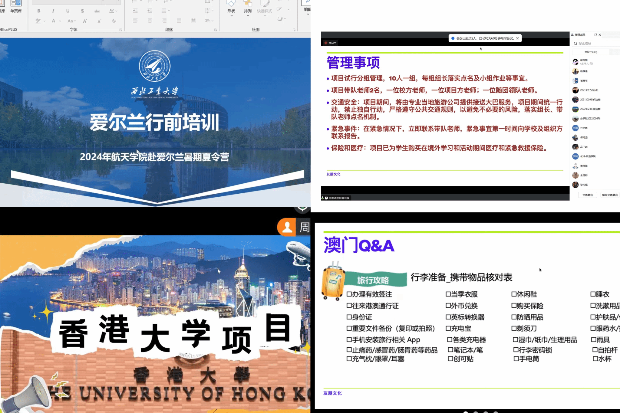 行前培训会基本以四部分为主体组成。第一部分为项目外方高校情况及项目行程介绍,第二部分为项目所在国别或地区证件、货币、餐饮、住宿及需携带物品情况,第三部分则重点强调在外期间外事纪律及管理事宜,第四部分则是针对学生的提问进行解答。